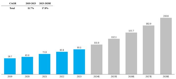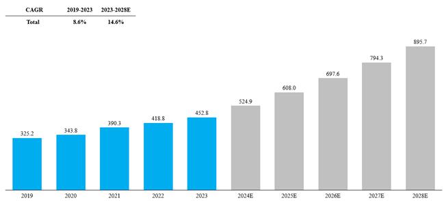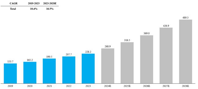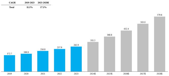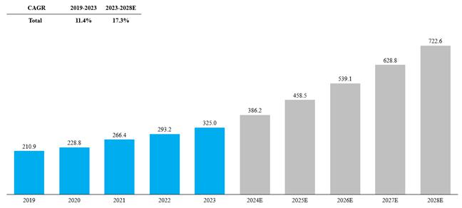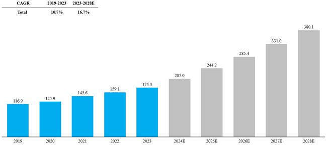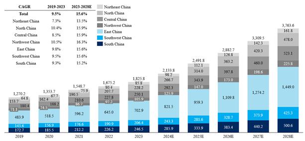 In recent years, driven by the national strategic direction, the development demand of various industries and the innovation of emerging technologies, the intelligent integrated solutions market in China has continued to expand. The market size of China intelligent integrated solutions industry market has increased from RMB1,270.2 billion in 2019 to RMB1,825.8 billion in 2023, representing a CAGR of 9.5% from 2019 to 2023. In the future, with the continued in-depth application of emerging technologies, as well as the increasing demand for intelligent integrated solutions from downstream end customers, it is expected that the market size of the intelligent integrated solutions industry in China will further expand. The market size of intelligent integrated solutions industry market in China is expected to reach RMB3,763.6 billion in 2028, representing a CAGR of 15.6% from 2023 to 2028.